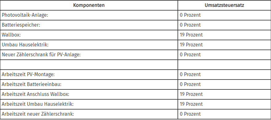 Seit dem 1. Januar 2023 fällt beim Kauf privater Photovoltaikanlagen für Wohngebäude keine Umsatzsteuer mehr an. Das Jahressteuergesetz hat einen Umsatzsteuersatz von 0 Prozent festgelegt, der unbefristet gilt und sowohl die Anlagen, Einzelkomponenten, Ersatzteile als auch Handwerksleistungen umfasst. Schon im Angebot und auf der Rechnung des Fachbetriebs muss „zzgl. 0 Prozent Umsatzsteuer/Mehrwertsteuer“ angegeben sein.